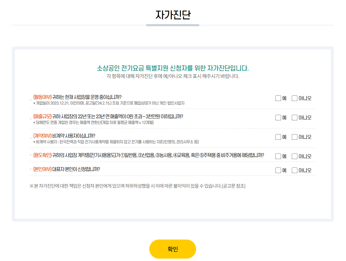 3. 그러면 자가진단 페이지가 나오는데 여기의 질문에 전부 "예"로 해당되어야 지원자격이니 체크하고 확인을 클릭합니다.