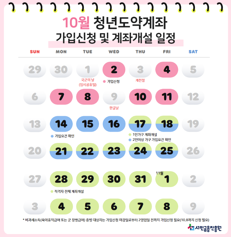 2024년 10월의 청년도약계좌 신청 기간은 10월 1일부터 약 6일간 진행됩니다. 이는 1일 임시공휴일, 3일 개천절, 9일 한글날로 인해 여타 달보다 줄어든 것입니다. 토요일과 일요일을 포함한 공휴일에는 신청이 불가능하므로, 가능한 일정 내에 신청하는 것이 중요합니다.